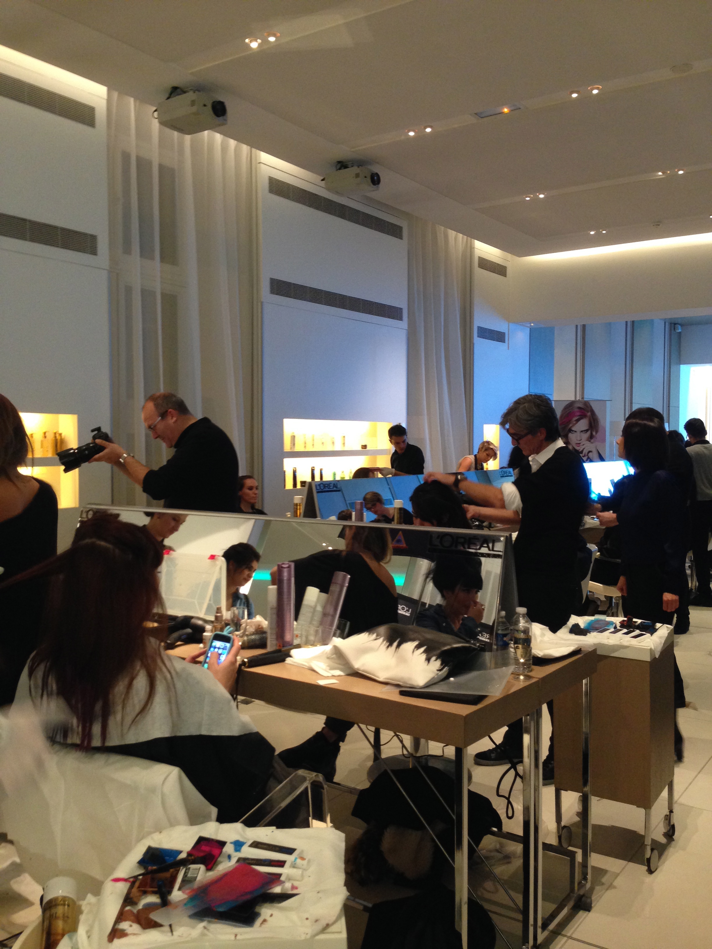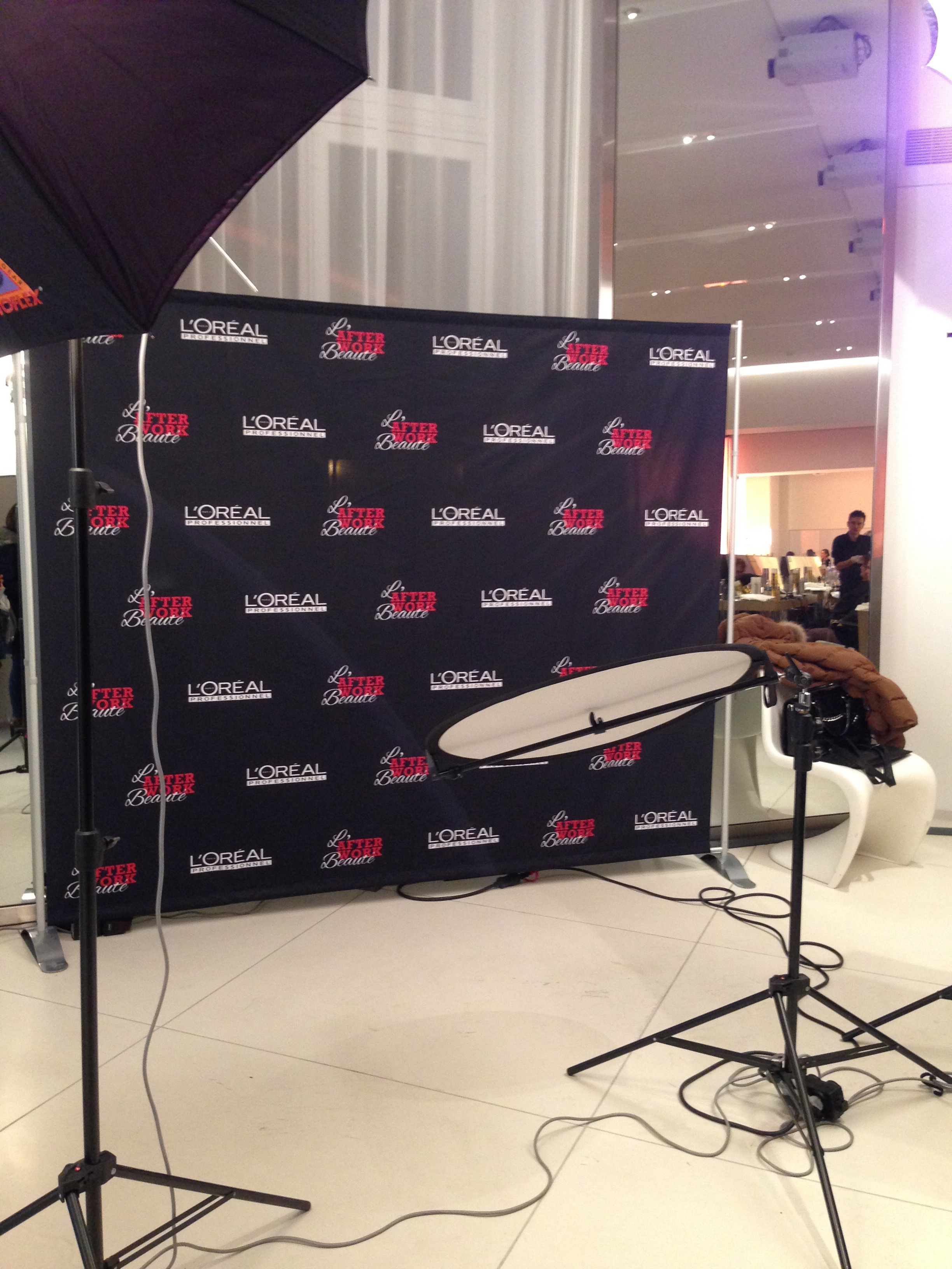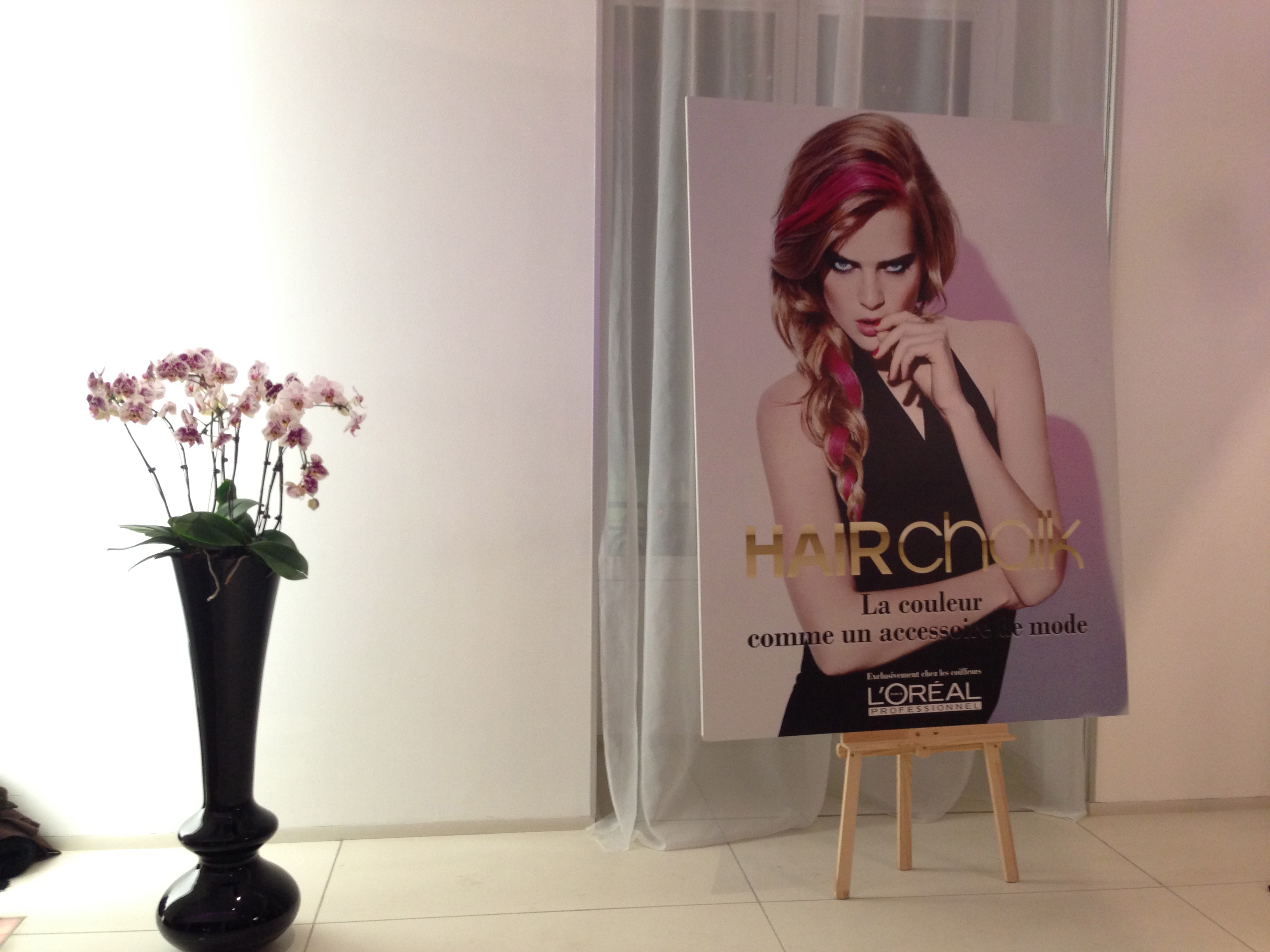 A l’entrée il y avait un grand poster noir super beau  avec une photo que j’avais déjà vue pour une coloration l’Oréal professionnel il me semble, et sur la droite il y avait un coin photo avec un photographe, la grande classe quoi !