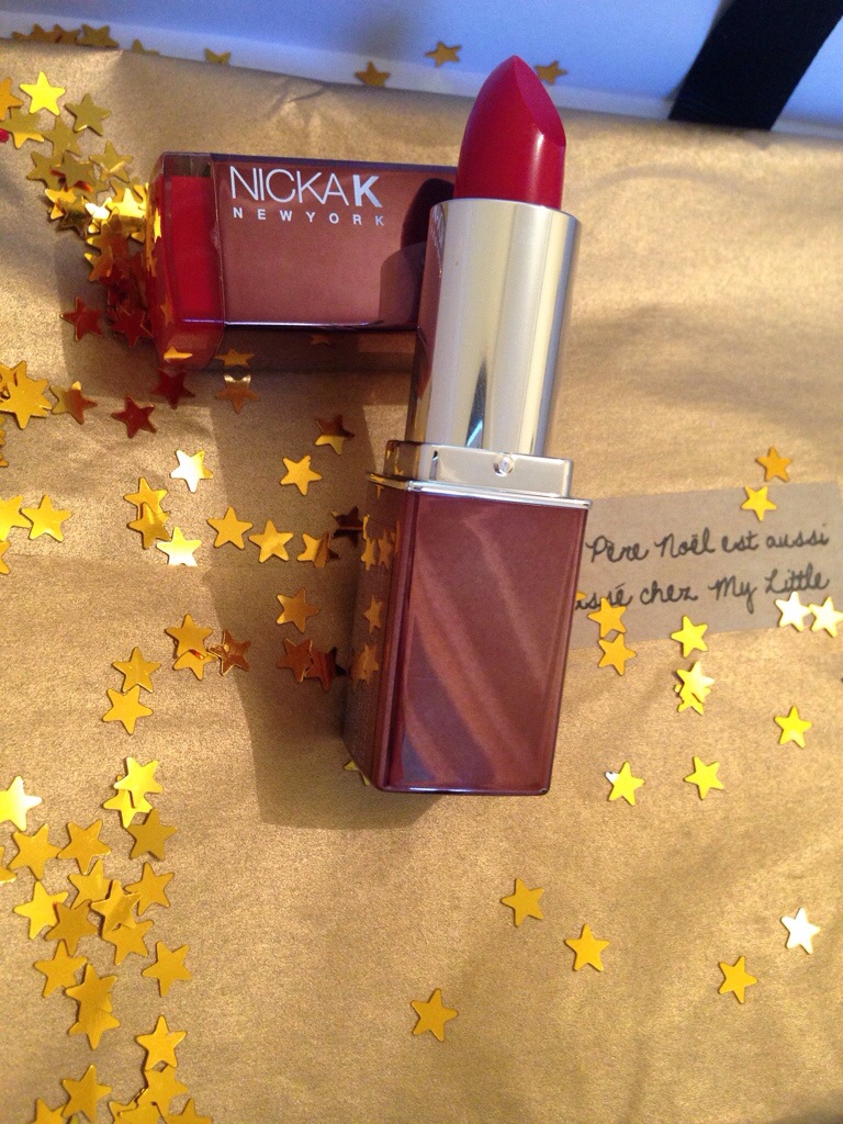 -Le rouge à lèvres lui est de la marque NICKA K que l’on ne peut pas encore trouver en France, c’est donc une exclu My Little. Je l’ai essayé au bureau (=un peu à l’arrache), en un seul passage sur les lèvres la couleur est intense, et surtout j’ai l’impression que le produit ne m’assèche pas les lèvres, cela fait déjà 2h que je porte le rouge et vraiment il est resté nickel, n’a pas filé et mes lèvres sont toujours hydratées.