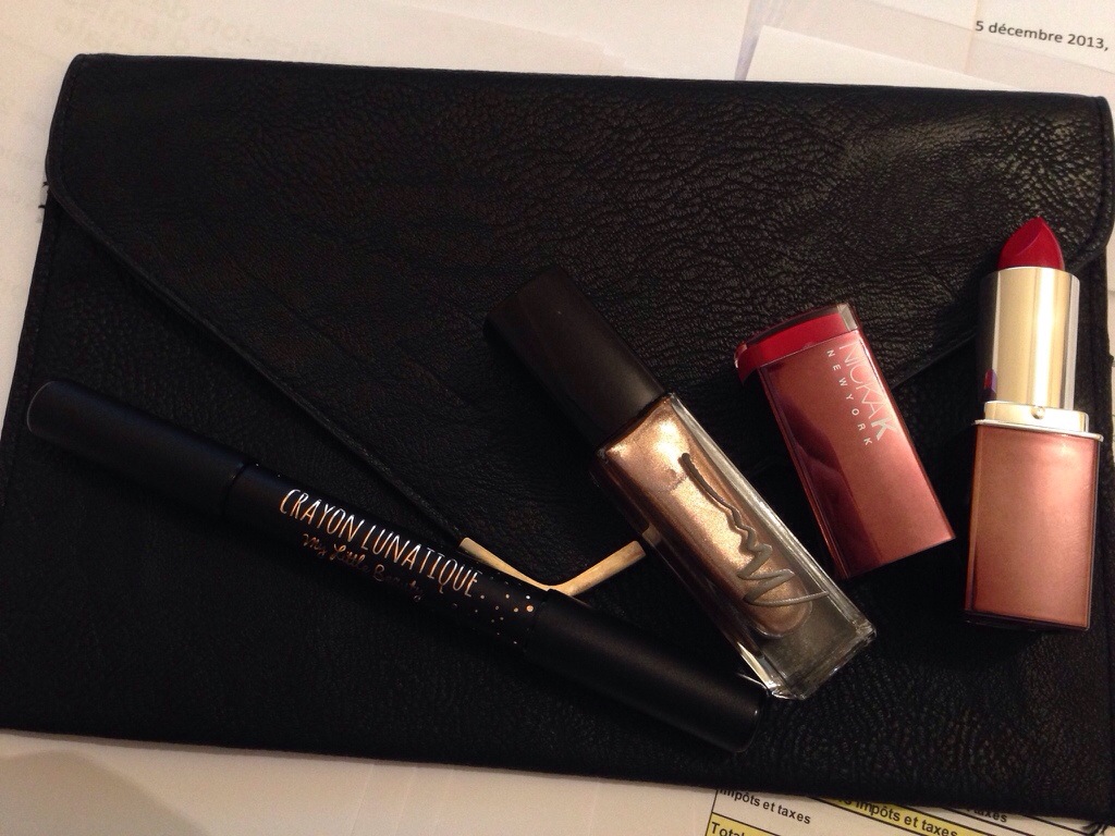 ensuite dans le pochon on trouve 3 produits: un vernis, un rouge à lèvres et un crayon à double côté. Voilà qui annonce un make up de fête complet !