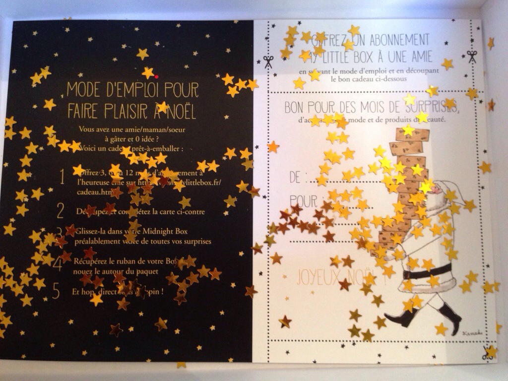 Comme d’hab on y trouve le magazine du mois et une carte. A l’ouverture de la box on peut voir des paillettes un peu partout, cela annonce bien la couleur !