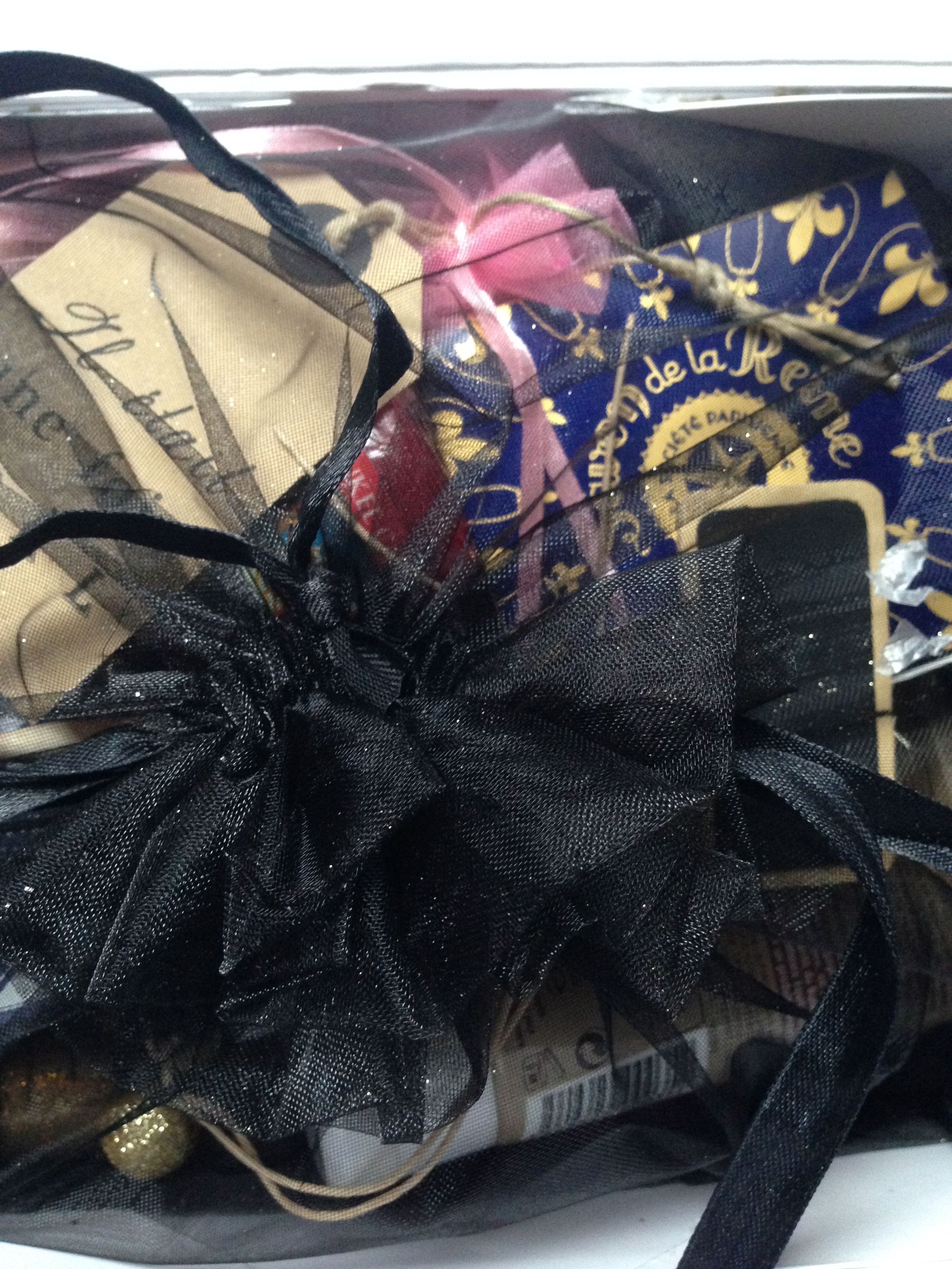 Dans le colis j’y trouve une box où  il y a un pochon façon organza, avec des pailettes tout partout encore une fois.