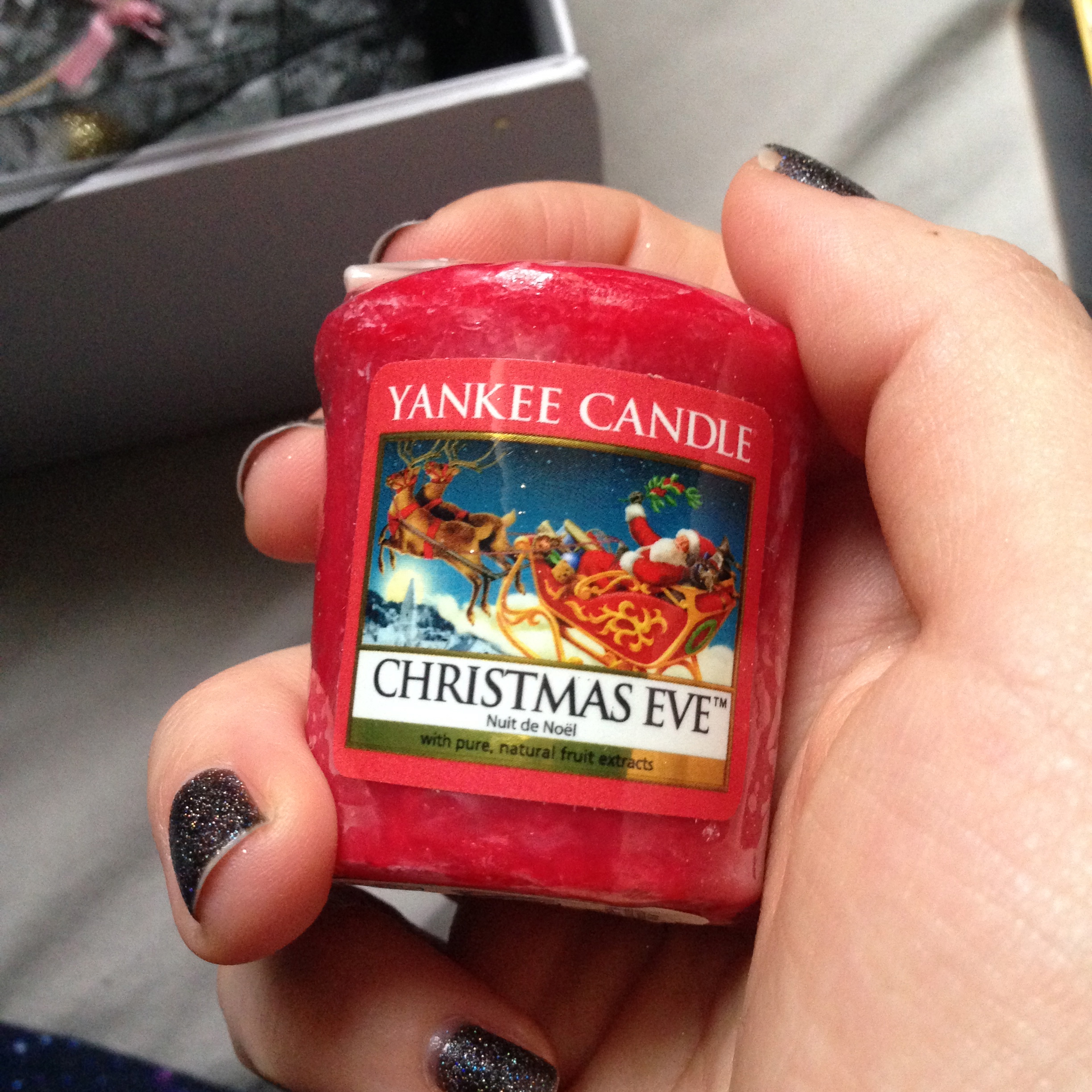 Ensuite il y a une petite bougie de la célèbre marque Yankee Candle. Je connaissais déjà la marque également, j’ai une connaissance qui en avait toujours chez elle, directement importées des US dans des gros pots. Je me souviens aussi que la bougie paraissait interminable et quelle sentait très bon. mais j’en ai jamais eu chez moi. Désormais c’est chose faite et à l’heure à laquelle j’écris cet article la petite bougie  au parfum « Christmas Eve » (extraits de fruits) est tranquillement en train de brûler et ma chambre sent bon !