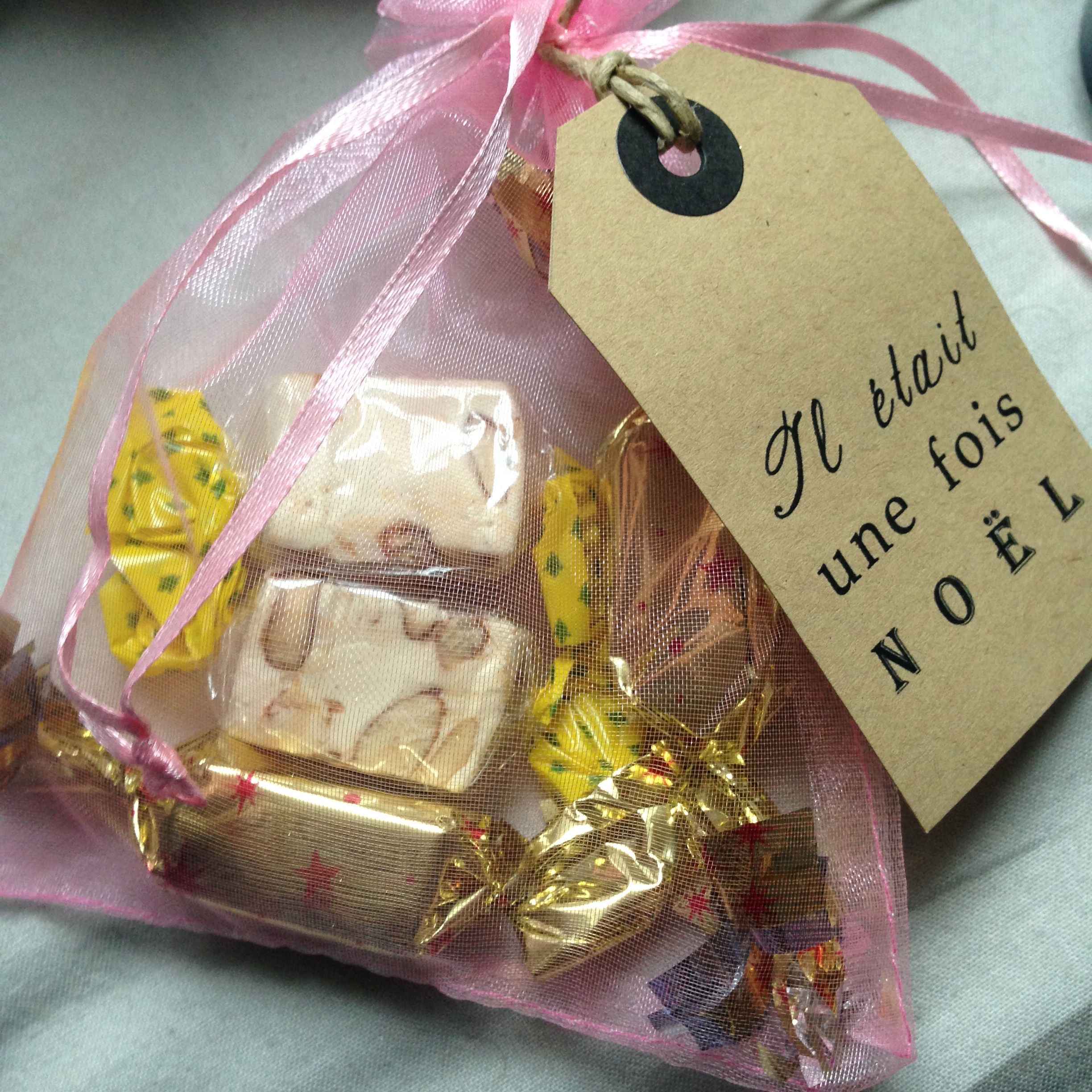 Un pochon avec des gourmandises: deux nougats mous et deux chocolats, ça je ne vais pas m’en plaindre.