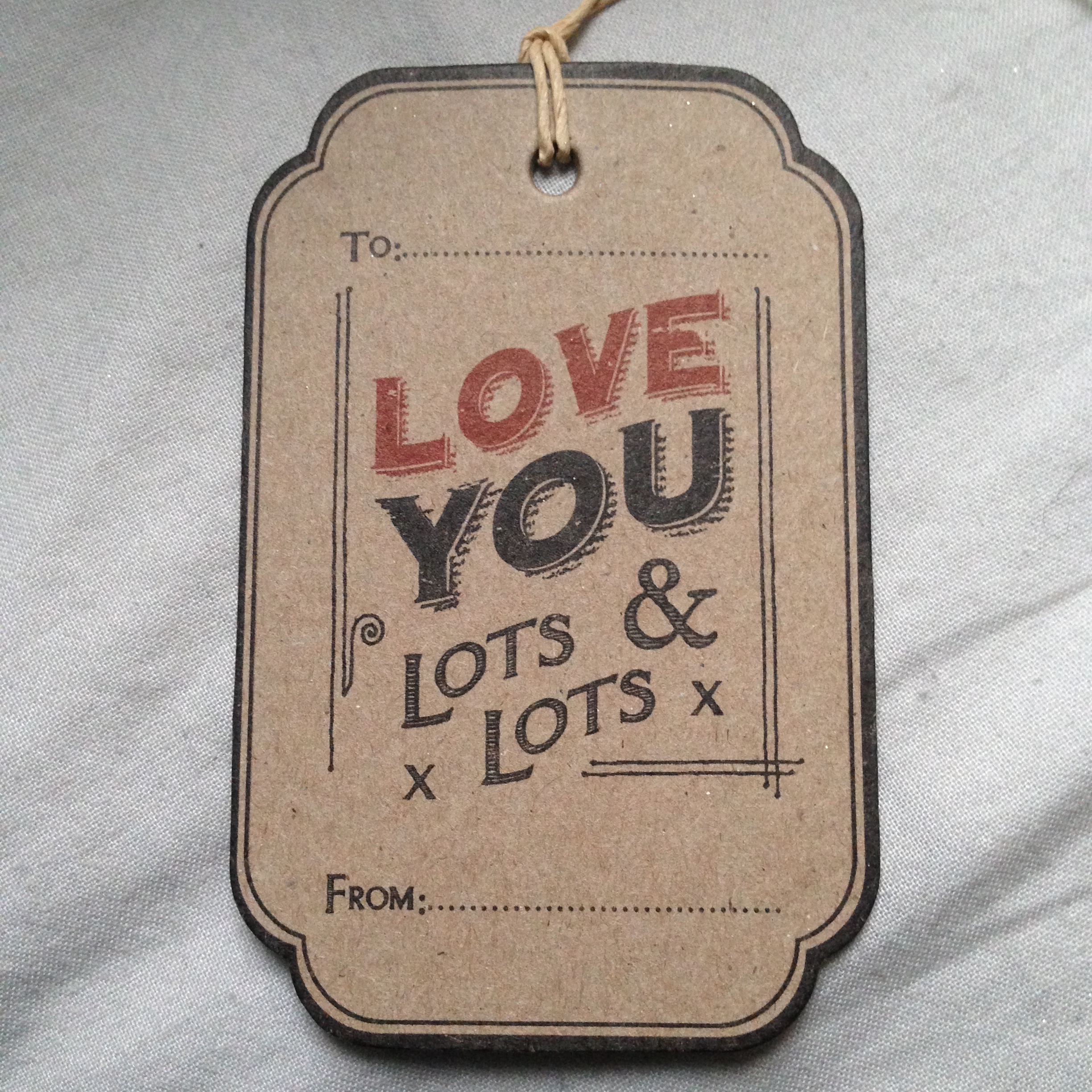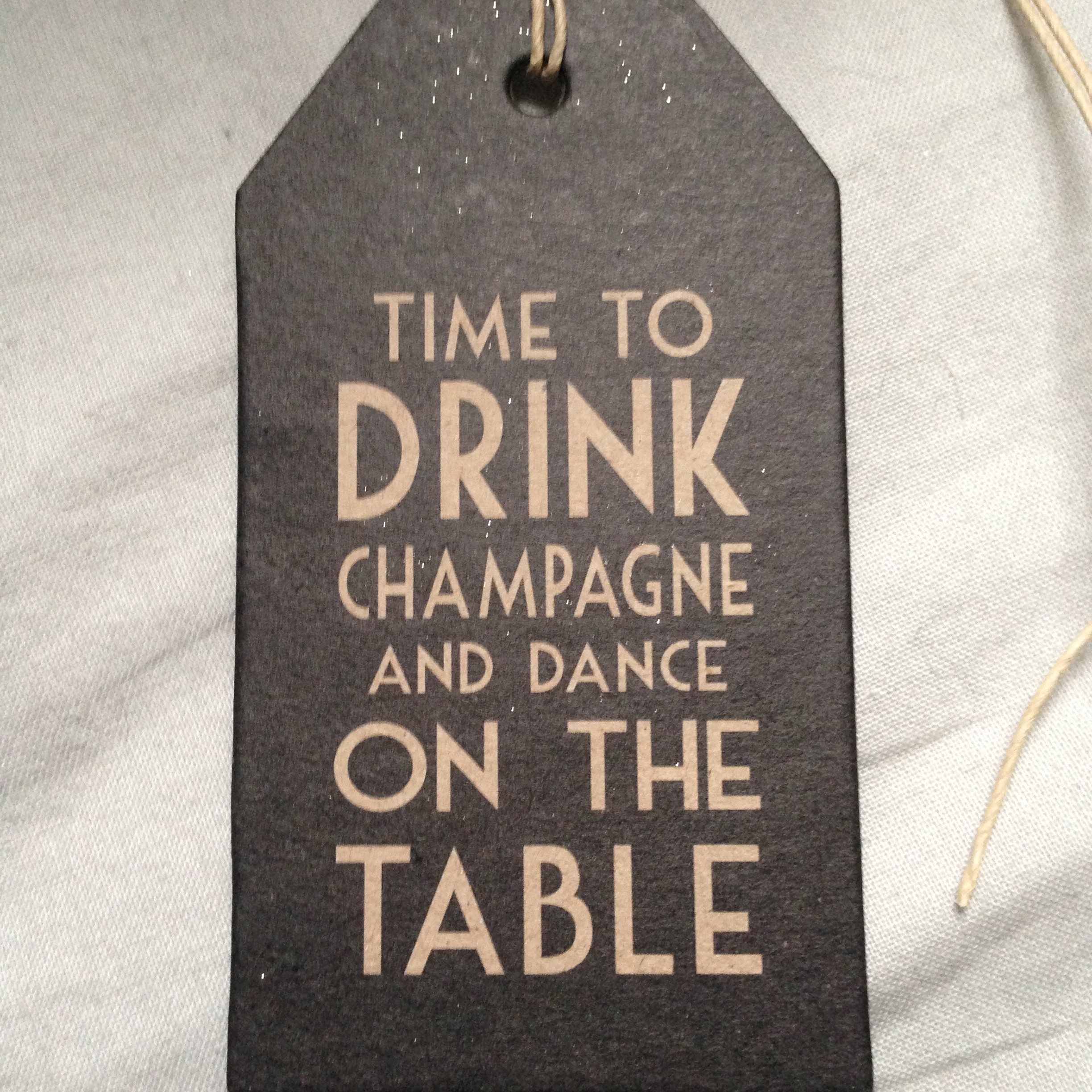 Des étiquettes East of India faites à la main, une pour le cadeau de chéri et une autre avec un message qui appelle à la fête « il est temps de boire du champagne et de danser sur la table ».