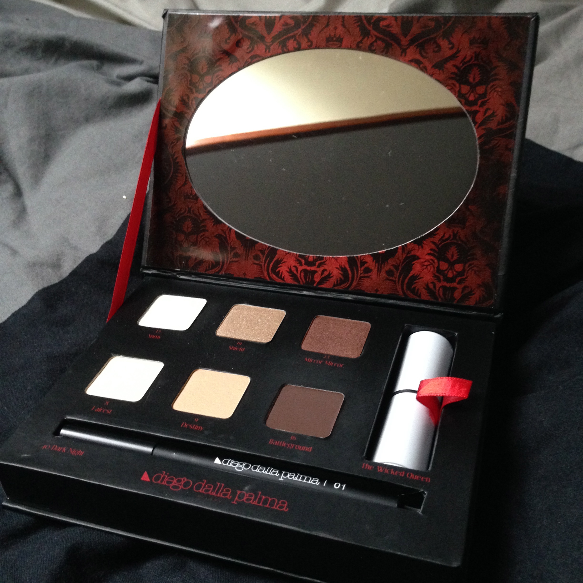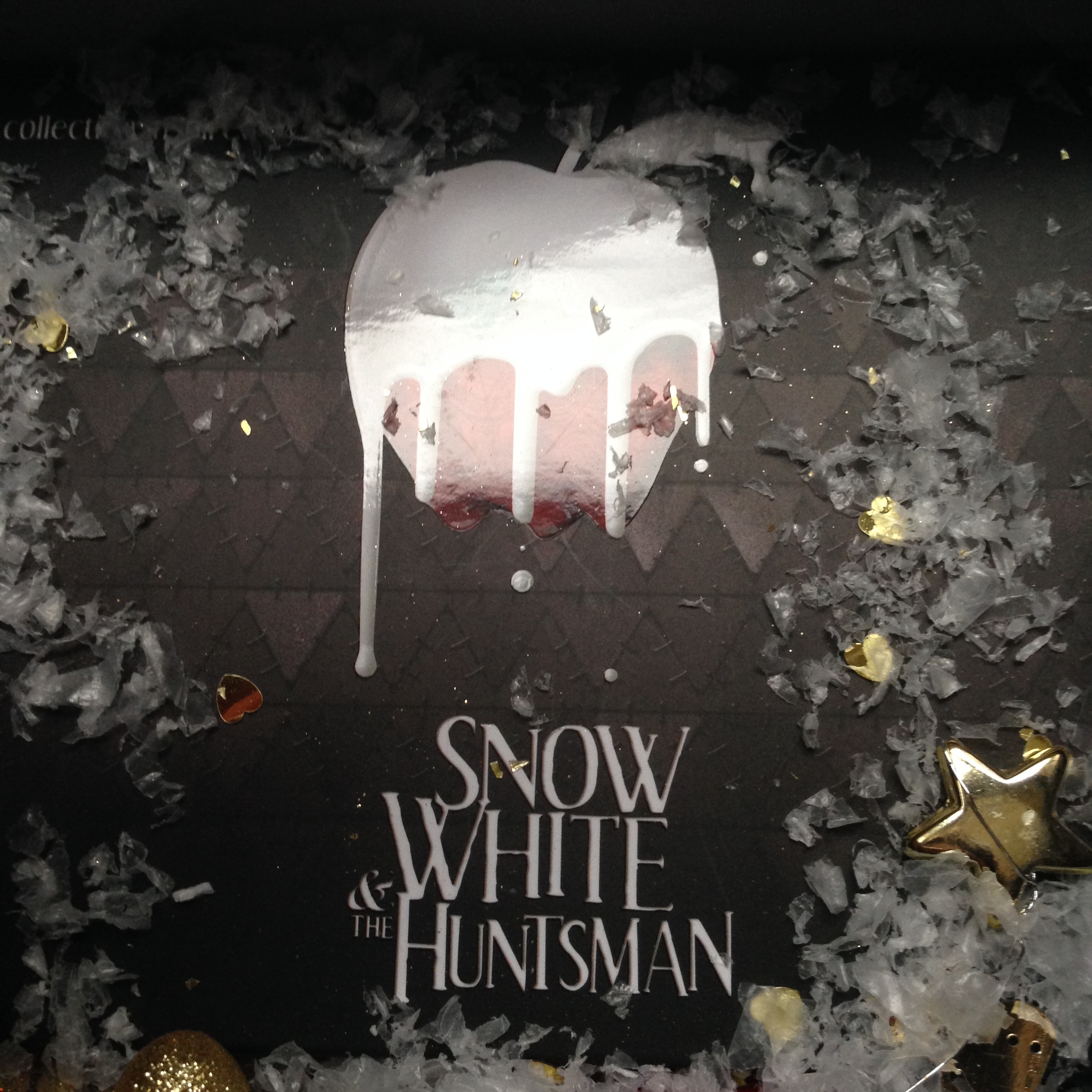 Ensuite vient le must de la box: une palette de la marque Diego dalla palma, marque qui a signé avec Universal pour sortir une ligne de produits dérivés du film « Blanche neige et le chasseur » en…2011 (je rappelle que le film est sorti dans les salles le 13 juin 2012), comme vous l’avez compris, un petit point négatif est marqué là. Le coffret est noté comme étant à 45€ dans la fiche récapitulative des produits de la box, mais après fait ma curieuse je l’ai trouvé sur plusieurs site aux environ de 15€, souvent moins. Heureusement qu’à l’ouverture je découvre un joli coffret dont les fards ne sont pas abimés (ni le rouge à lèvres).