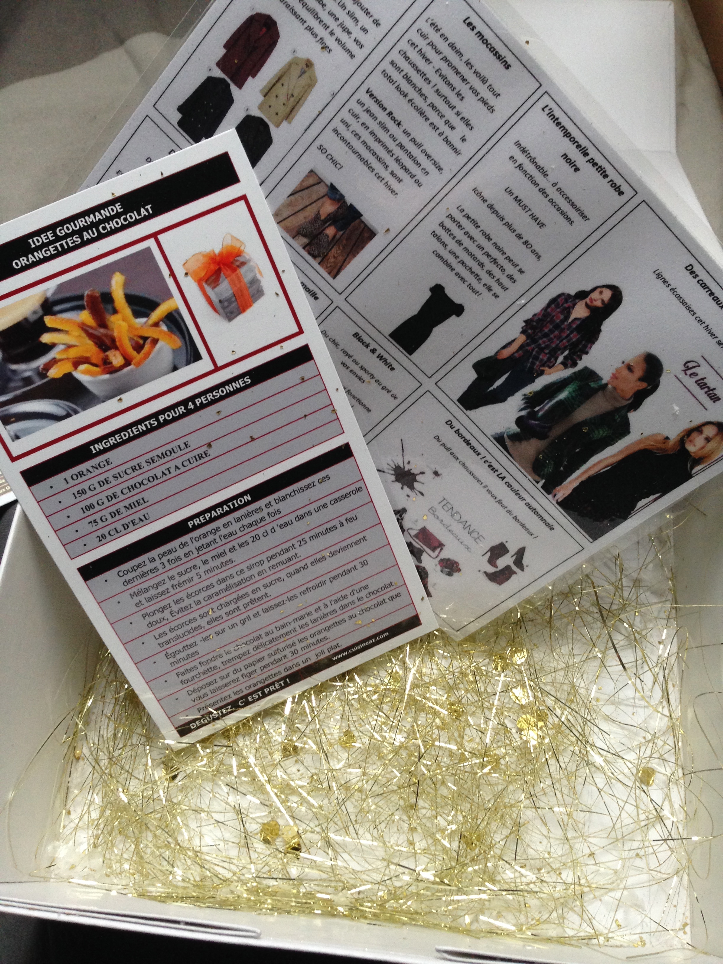 IMG_3395Pour finir au fond de la box il y a des fils d’or et une fiche recette pour faire des orangettes au chocolat et une fiche pratique des tendances de la saison Automne Hiver 2013 et ça aussi c’est un petit point positif !