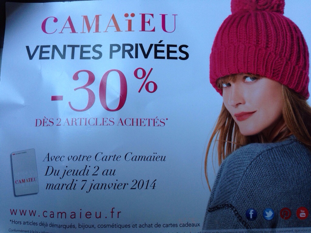 1. Je rajouterais Camaieu avec -30% jusqu’au 7 janvier avec le code VPFID2 sur internet ou en magasin sur présentation du texto reçu.