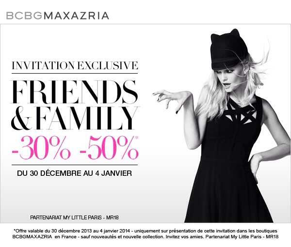 Enfin MylittleParis a encore frappé en faisant un partenariat avec la marque très chic BCBGMAXAZRIA offre entre 30 et 50% sur la collection Automne Hiver mais il faudra imprimer l’invitation que vous trouverez en image ci dessous et se déplacer pour pouvoir en profiter jusqu’au 4/01.