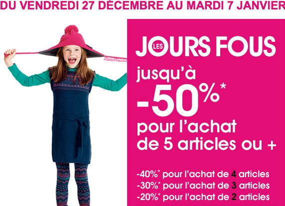 • On continue avec une marque qui propose de la mode à petits prix, vous l’aurez compris je parle de Kiabi. Comme La City, Kiabi propose un système de réductions progressives allant jusqu’à 50% sur les produits signalés « Jours Fous ». C’est plutôt pas mal, surtout pour habiller les enfants ou tout simplement pour se faire plaisir. Pour en profitez cliquez ici.