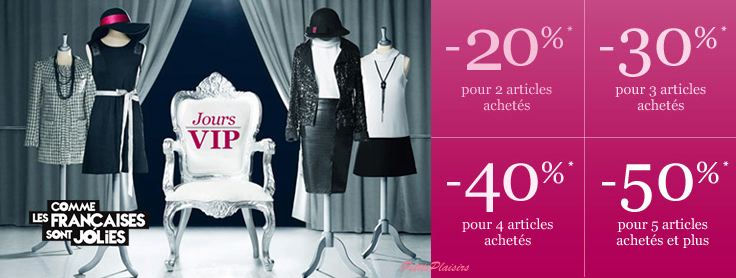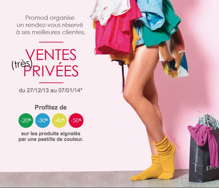 • Chez Promod, sur présentation de cette invitation et de votre carte de fidélité vous pourrez bénéficier des ventes privées également (du 27 au 7 janvier 2014). Cette offre est disponible sur leur site internet (ici) en indiquant le code VIP. Les offres vont jusqu’à -70% (même si c’est pas annoncé).