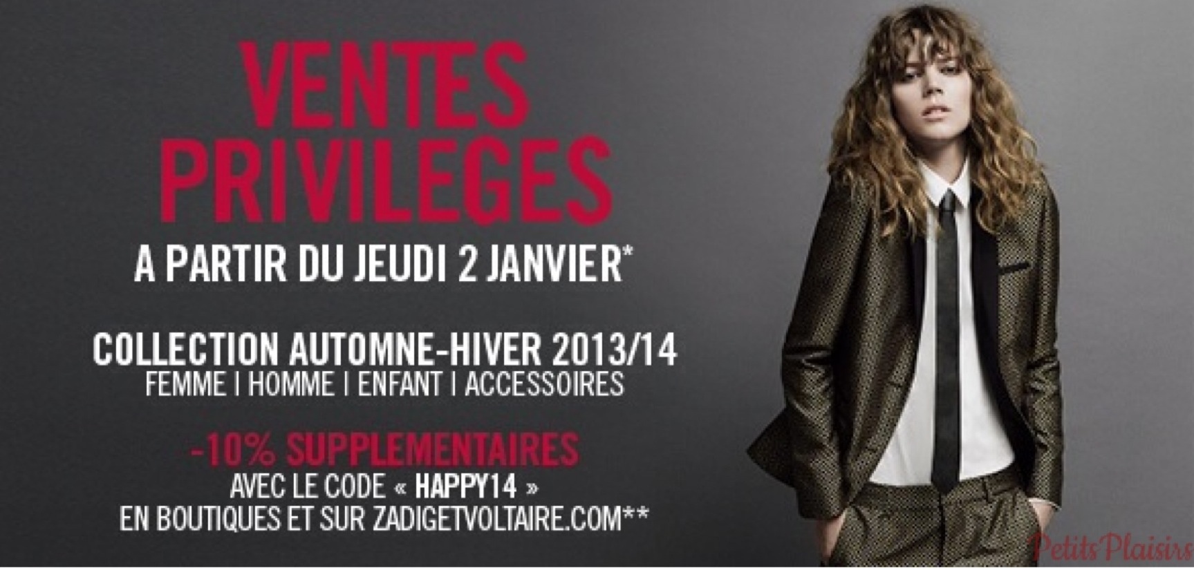 • pour rester dans les marques chic, il y a également des ventes privilèges chez Zadig & Voltaire, et cerise sur le gateau vous pouvez bénéficier de 10% de réduction supplémentaires en entrant le code HAPPY14 sur le e-shop ou en imprimant cette invitation (ici).