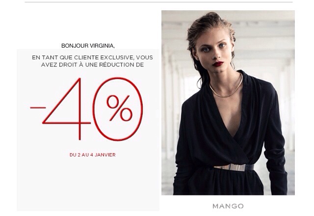 • Chez MANGO retrouvez 40% de réduction sur toute la collection (sans minimum d’achat, je précise car souvent il y a un minimum de plus de 100€ pour bénéficier des 40%) du 2 au 4 Janvier 2014 sur le site internet (avec le code 6VIPFR13) mais aussi en magasin en imprimant ce mail (Bon, il y a mon nom dessus mais ça devrait fonctionner).