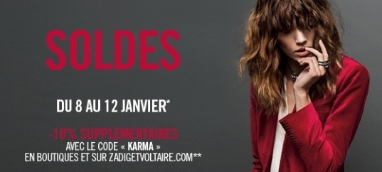 Comme pour les ventes privées, Zadig & Voltaire propose 10% de remise supplémentaire pour tout achat d’article(s) soldé(s), ça se passe en boutique et sur le site internet avec le code KARMA. Attention cette offre est valable jusqu’au 12 janvier ! (fini)