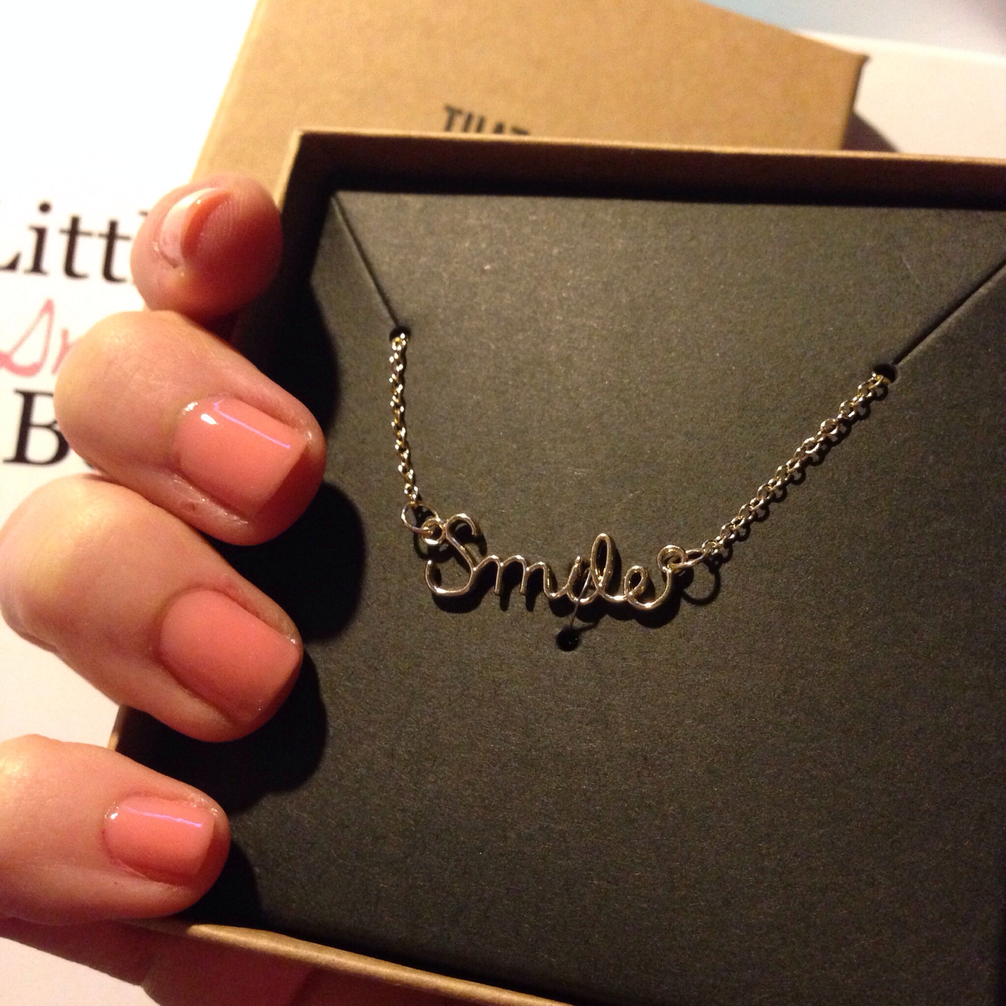 Enfin, après le pochon, je découvre une petite boîte avec à l’intérieur un collier « Smile ». J’ai adoré le collier, je le trouve fin et mignon. Je n’aime pas le colliers à messages (que je trouve bien trop souvent bling-bling) mais je dois avouer que celui ci est juste parfait !