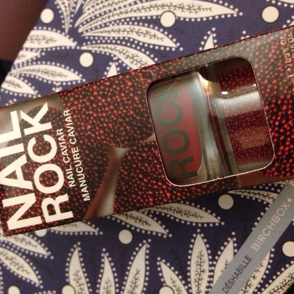 Un vernis à ongles rouge avec des petites billets rouges à appliquer sur le vernis pour un effet « caviar ». Je ne suis pas très fan de ce genre de manucure.