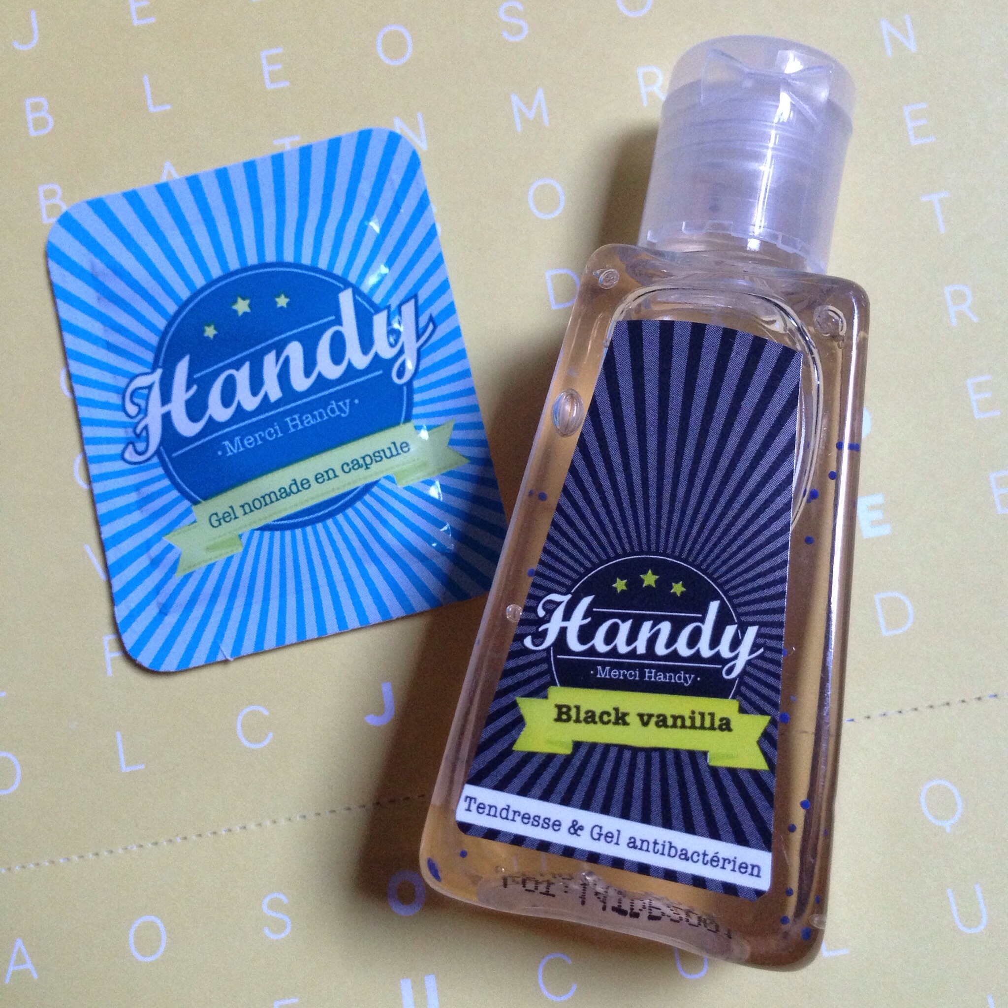 Ensuite j’ai reçu deux formats différents du même produit: du gel anti-bactérien au nom d’Handy (dis moi oui -et là j’ai la chanson des Rita Mitsouko qui résonne dans ma tête).