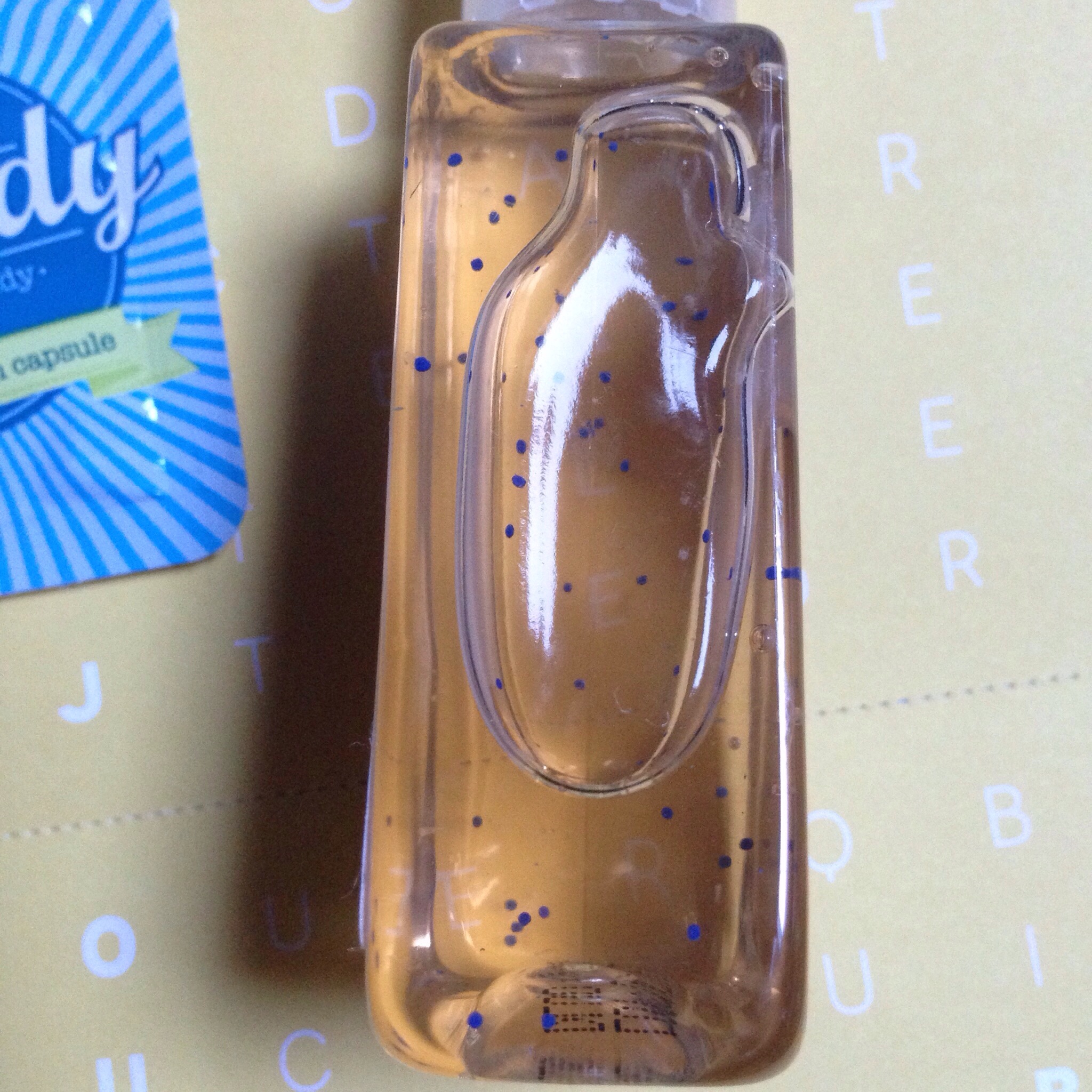 Les deux formats sont adaptés aux petits sacs )à mains ou même aux poches: un flacon et une capsule. Le plus grand est un flacon de 30mL de gel transparent avec des petites billets bleues et à l’odeur de vanille. Et la petite capsule est une petite unidose de produit qui peut se glisser partout, super pratique ! Je craque !