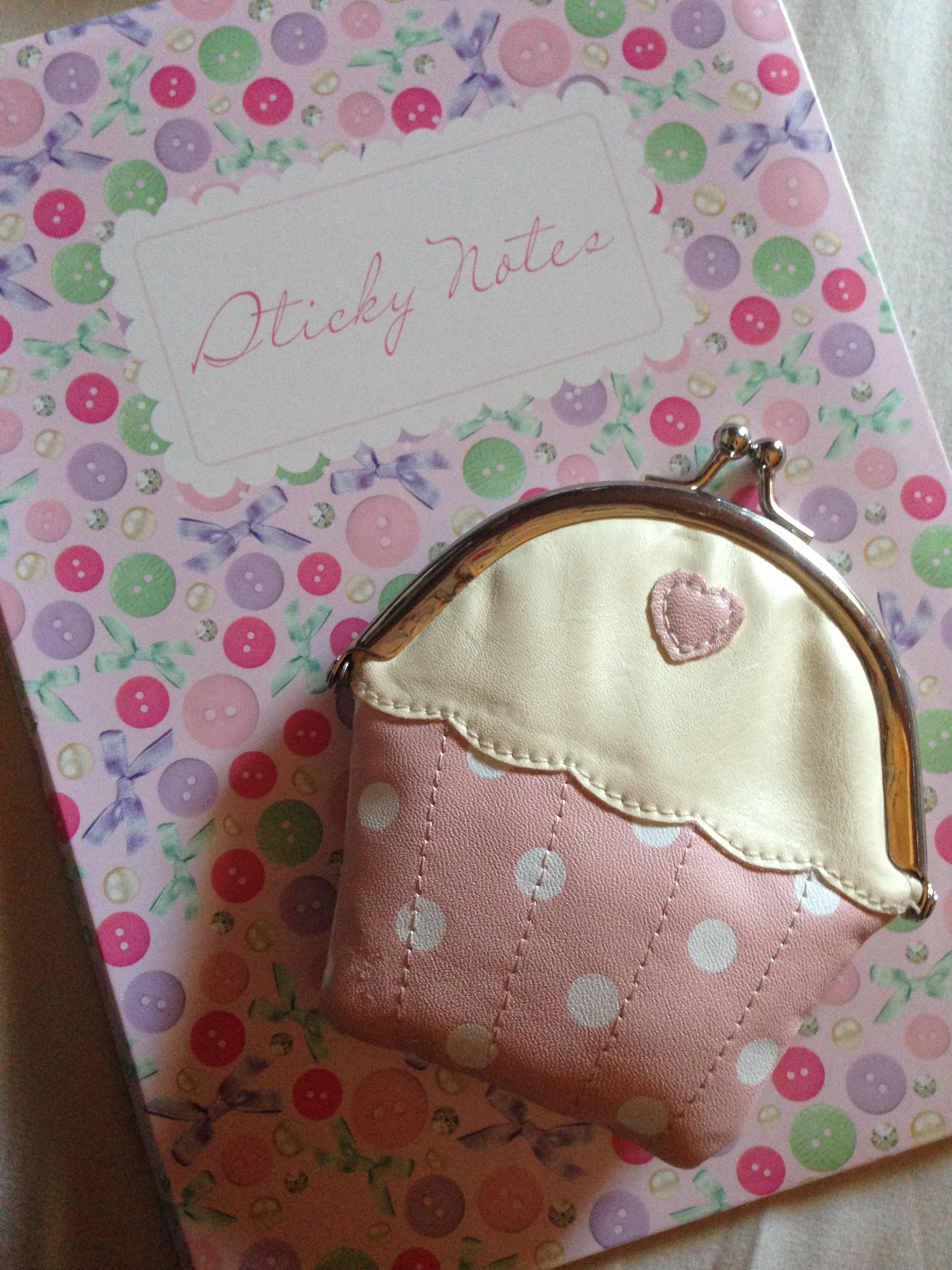 Un carnet où il y a des jolis post-it et un porte monnaie cupcake. Trop de mignonnettes. 0,50 cts et 3,50€.