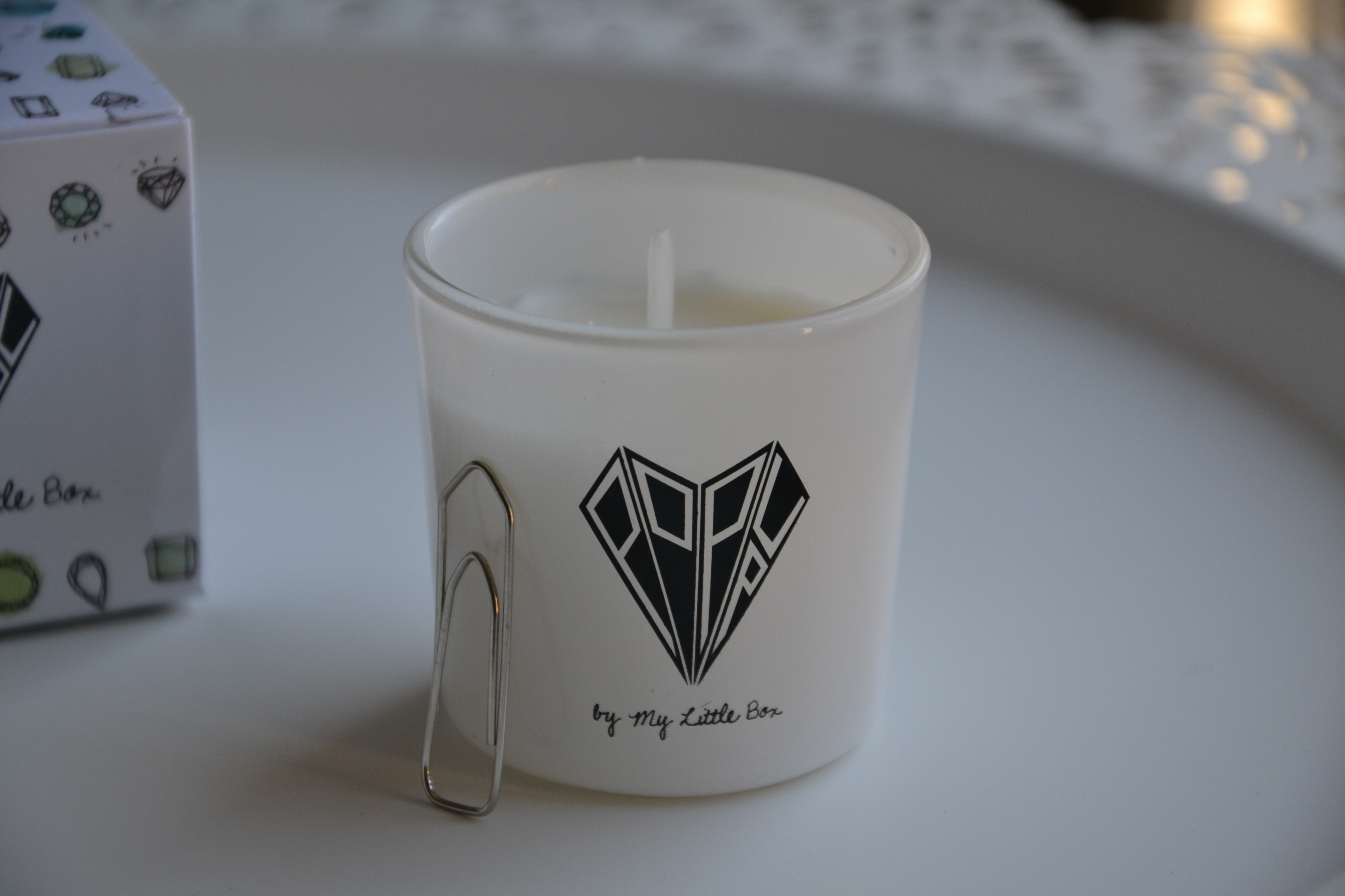 Parlons maintenant de la bougie en soi: plusieurs parfums ont été distribués, pour ma part j’ai eu figue et j’en suis plutôt satisfaite. Par contre la bougie est riquiqui, toute petite, et pour preuve, j’ai mis un trombone juste à côté pour que vous puissiez réaliser un peu la taille du truc ! Bon, après je râle mais en même temps je me voyais pas recevoir un jarre Yankee Candle dans ma box.