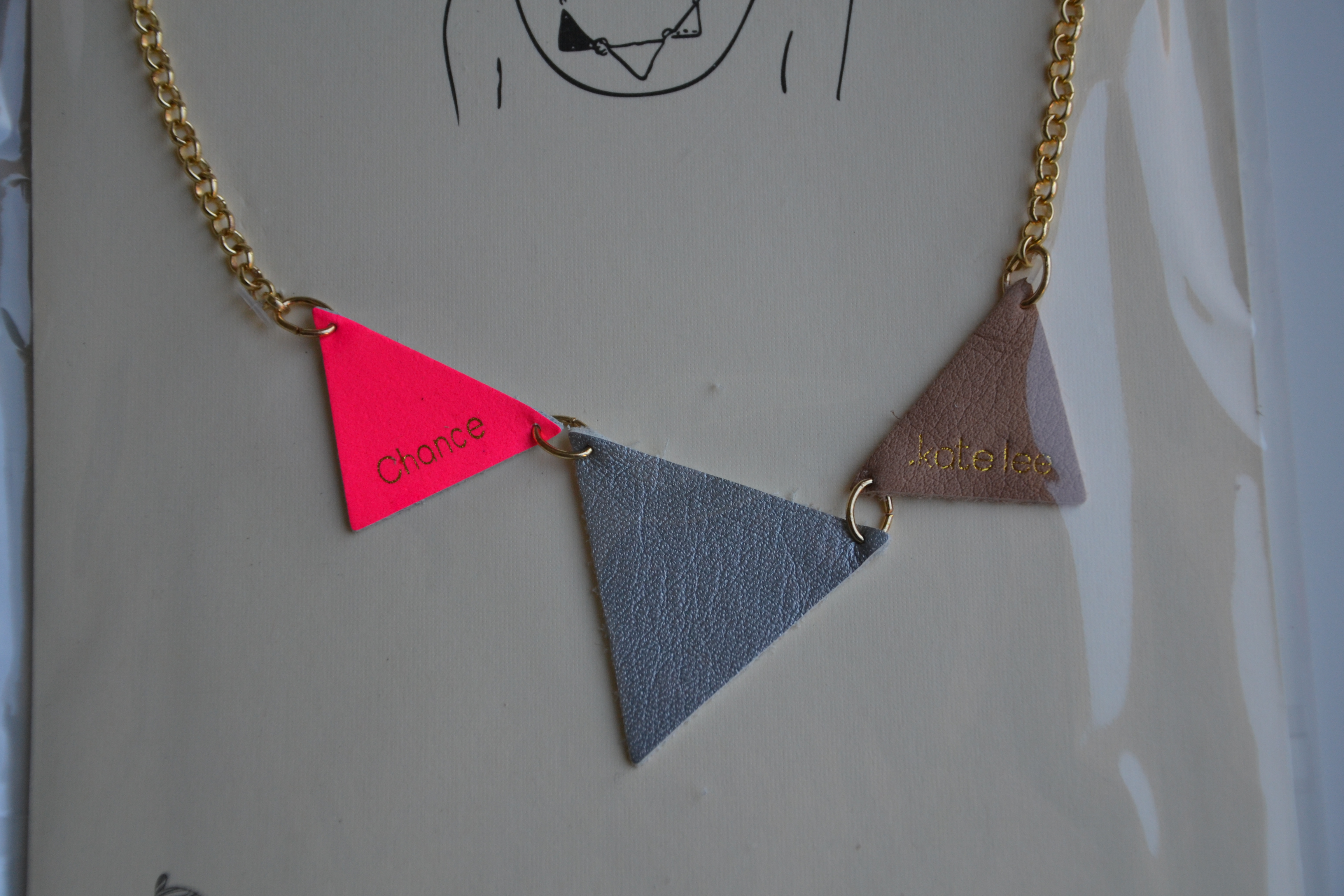 Et pour finir, il y avait un deuxième goodie signé Kate Lee: un collier avec trois triangles en cuir. Je trouve le collier très joli sauf que je n’aime pas trop le côté fluo du mien, je préfère celui dans les tons taupe, nude. (avis à celles qui veulent échanger, je compte le troquer !).