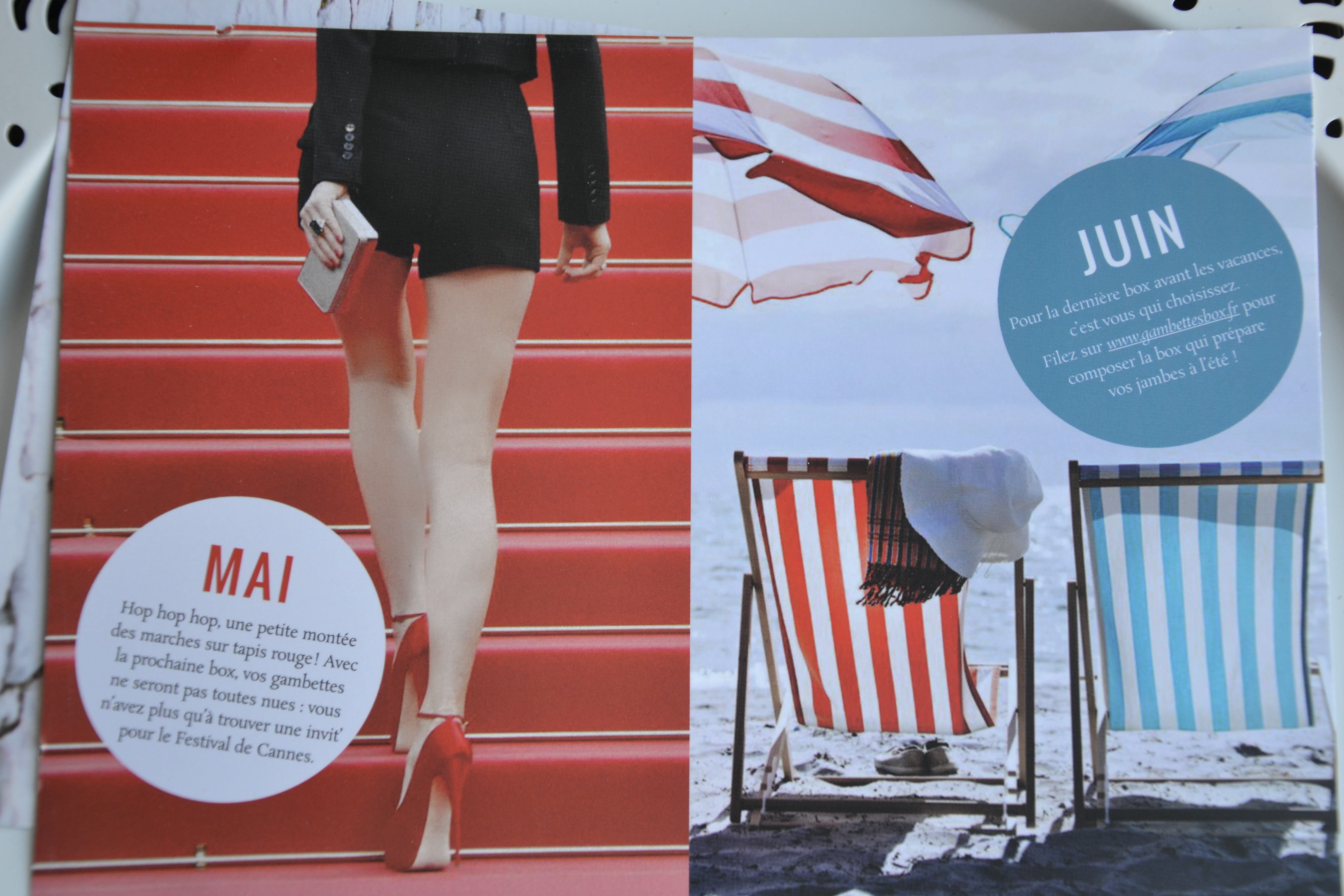 Pour le mois de Mai Gambettes box nous réserve une box spécial Festival de Cannes, l’année dernière pour le mois de Mai je me souviens qu’il y avait eu un collant trop mignon avec des ancres ! J’espère que la box sera canon !