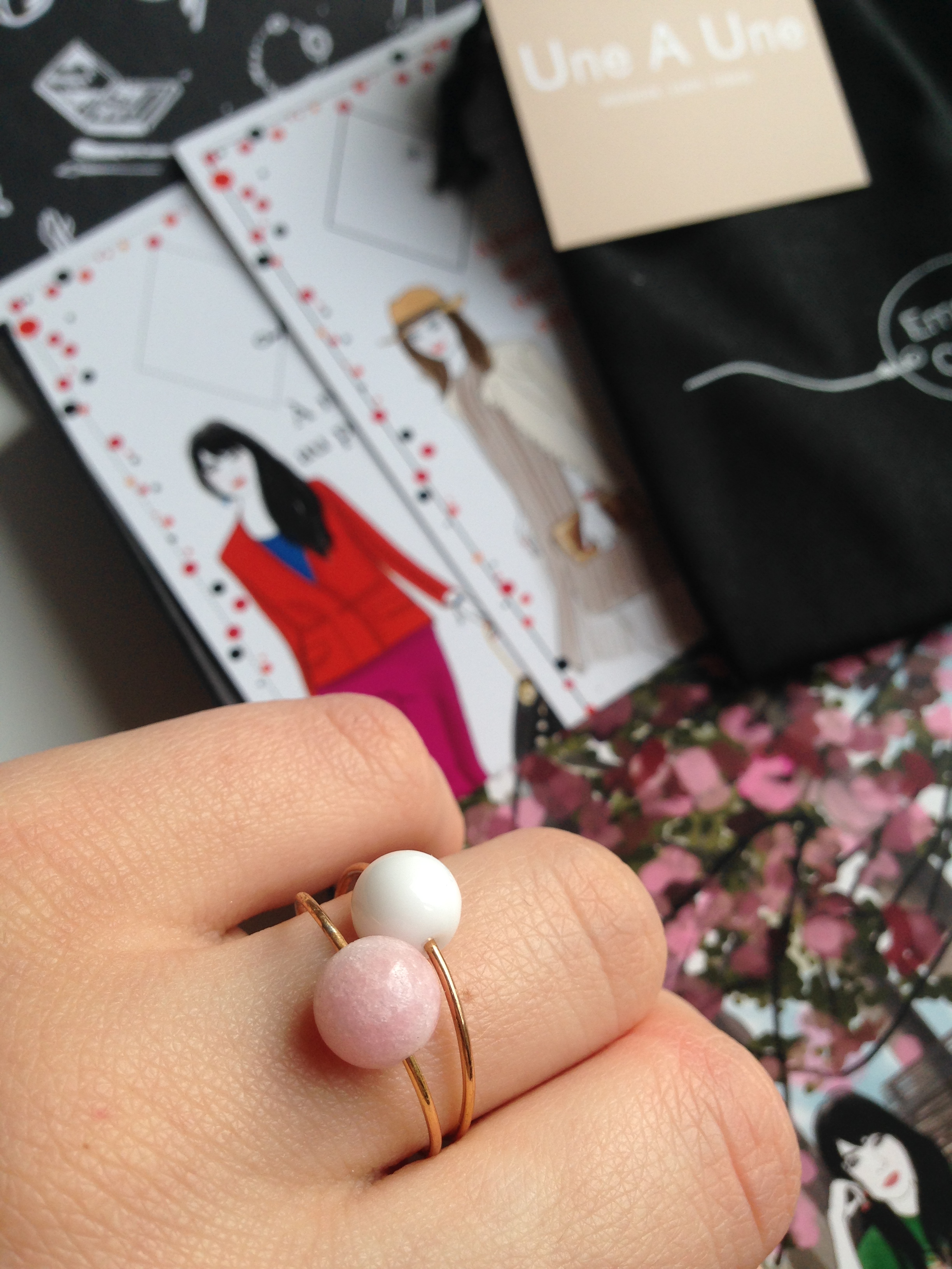 La créatrice mise en lumière au mois d’avril est donc Une à Une avec deux bagues plaquées Or 18 carats en Agate et Amazonite. J’ai reçu une bague blanche et une autre rose claire. Je les aime bien mais le système de mise à la taille est pas très pratique, je l’accroche à chaque fois que je me lave les mains. Il faut que je fasse attention mais c’est tout, je les aime assez mes petites bagues ! De plus on peut les porter seules ou ensemble sur le même doigt!