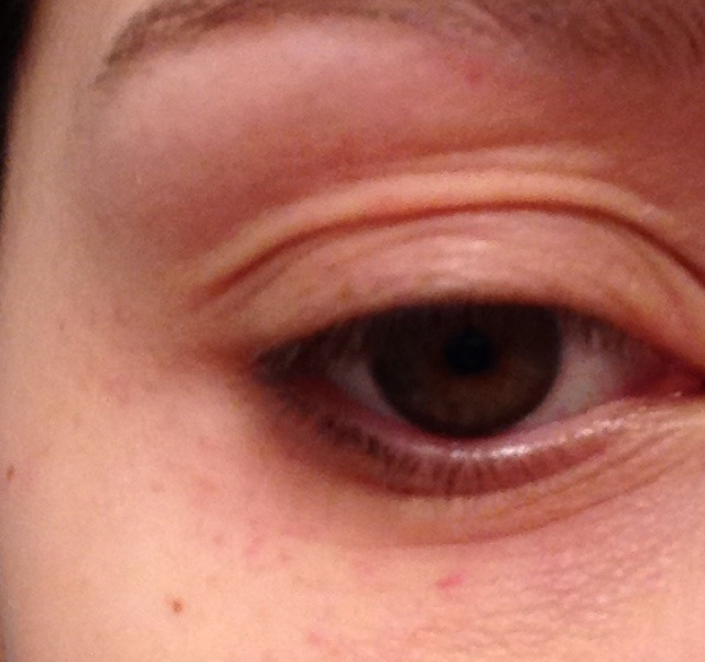 10327247_10202932519886924_929178458_nEt voici avec la peau maquillée, là on voit bien l’aspect « rugueux »du contour de l’oeil, et ça remonte bien jusqu’au sourcil. On voit également que ma paupière est gonflée.