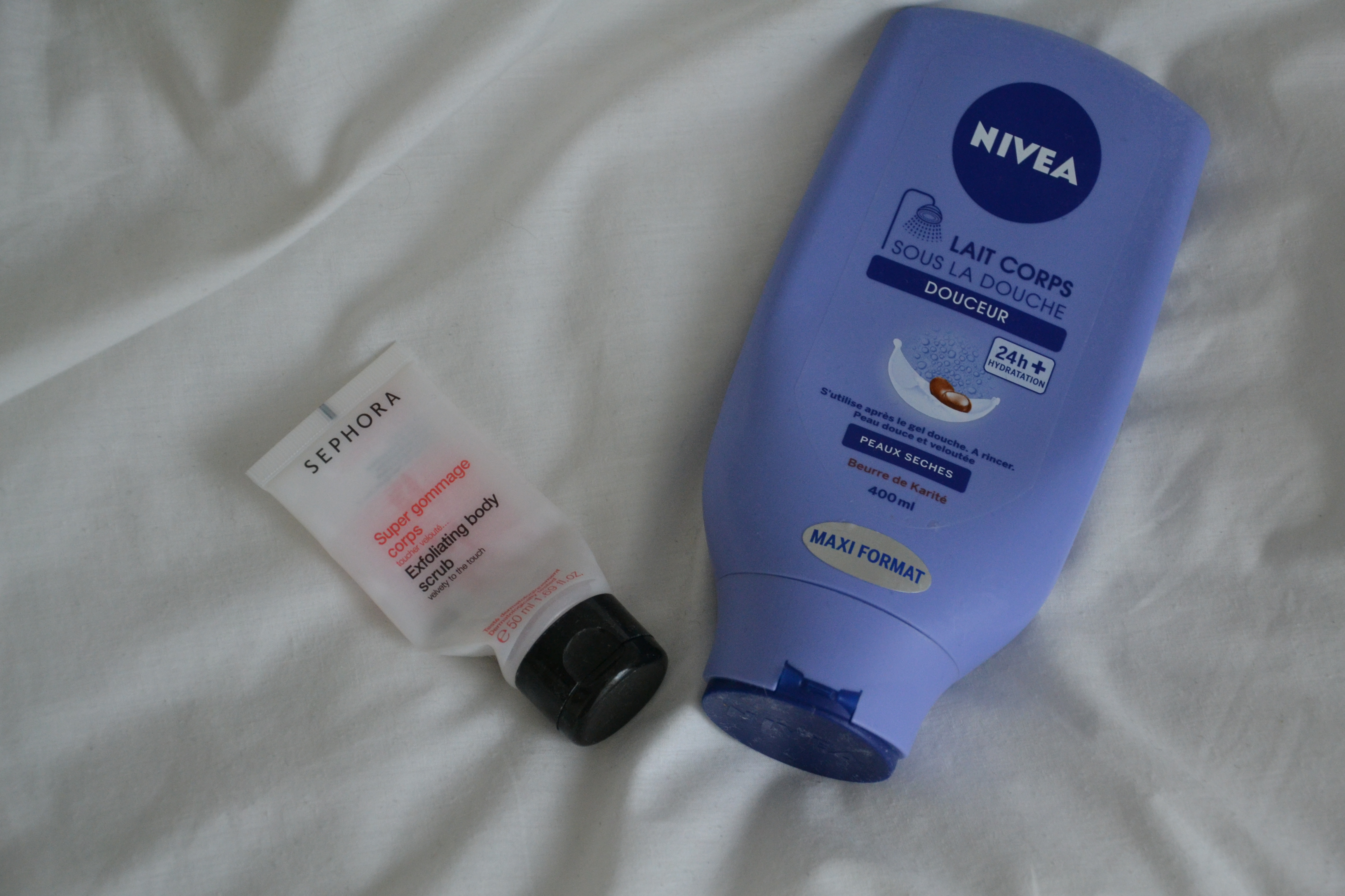 On lave, on hydrate et on gomme. On commence par le gommage, celui-ci est le super gommage corps de chez Sephora.
