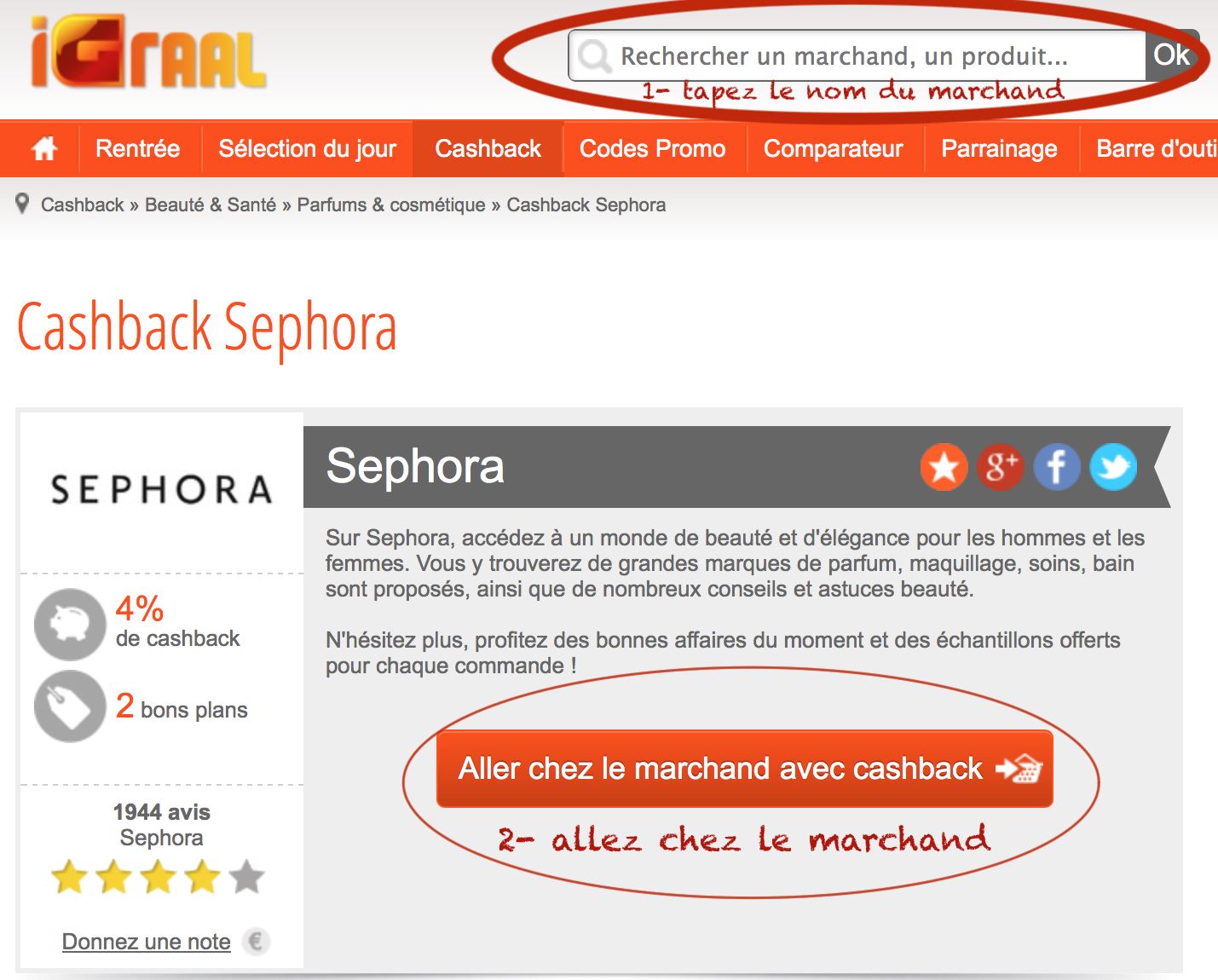 Par exemple pour shopper chez Sephora, je vais sur le site d’igraal, je tape Sephora dans la barre de recherche, je vais sur la fiche du marchand puis je clique sur « aller chez le marchand » et je suis redirigée vers le site de Sephora. A partir de là, 4% de mon achat fait sur le site est reversé sur mon compte igraal.