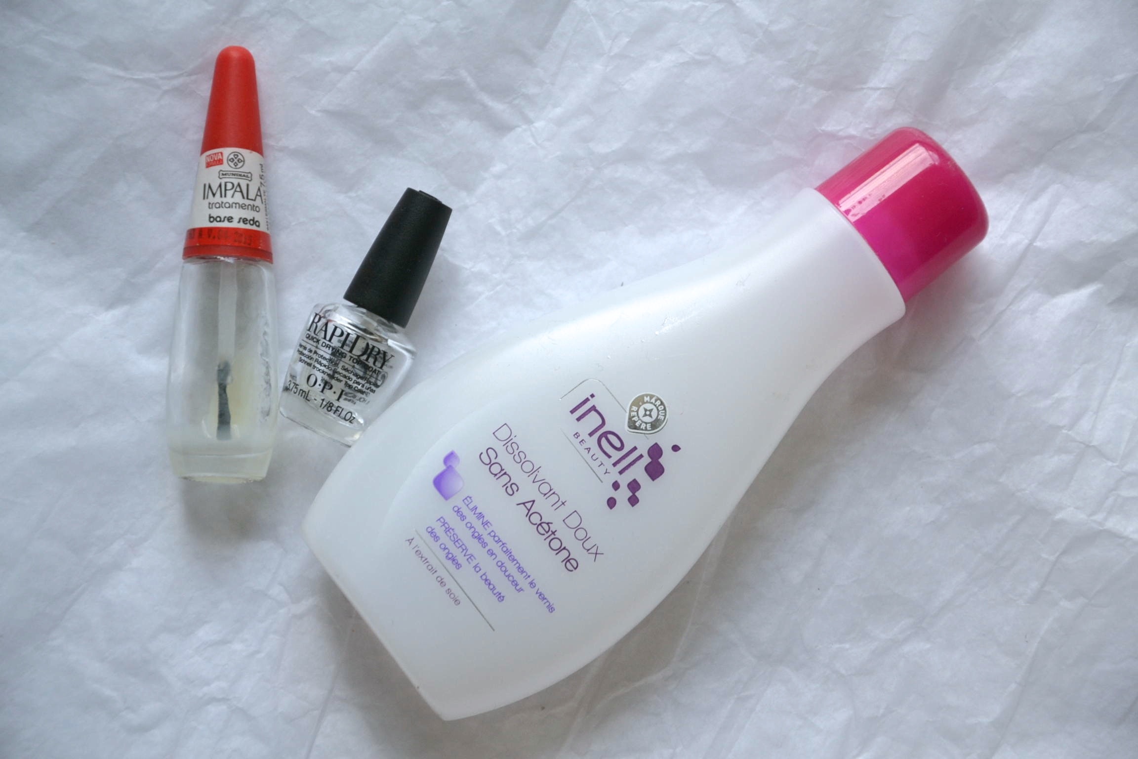 Maintenant le soin des mimines, avec ces 3 produits. Une base, un accélérateur de séchage et un dissolvant.