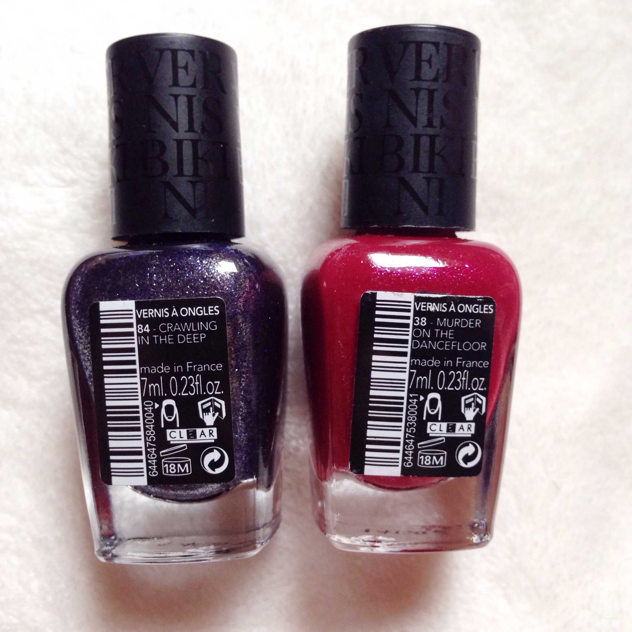Les deux vernis pour lesquels j’ai craqué sont les références: 38- Murder on the dancefloor qui est un beau rouge bordeaux avec des toutes petites pailletes et 84 – crawling in the deep, un bleu nuit à paillettes également. Les vernis sont vendus à 3,95€ l’unité et il y a 98 références, de quoi faire tourner la tête à n’importe quelle NPA (nail polish addict pour les intimes). J’ai essayé les deux vernis, la rouge a tenu 4 jours sans bouger, et le bleu 2 jours sans bouger (mais je me suis servie de mes ongles comme outils dimanche au boulot, c’est pas bien je sais mais j’avais pas le choix).  Bon ce n’est pas exceptionnel mais en fait si car pour un vernis payé moins de 5€ je trouve ça pas mal !