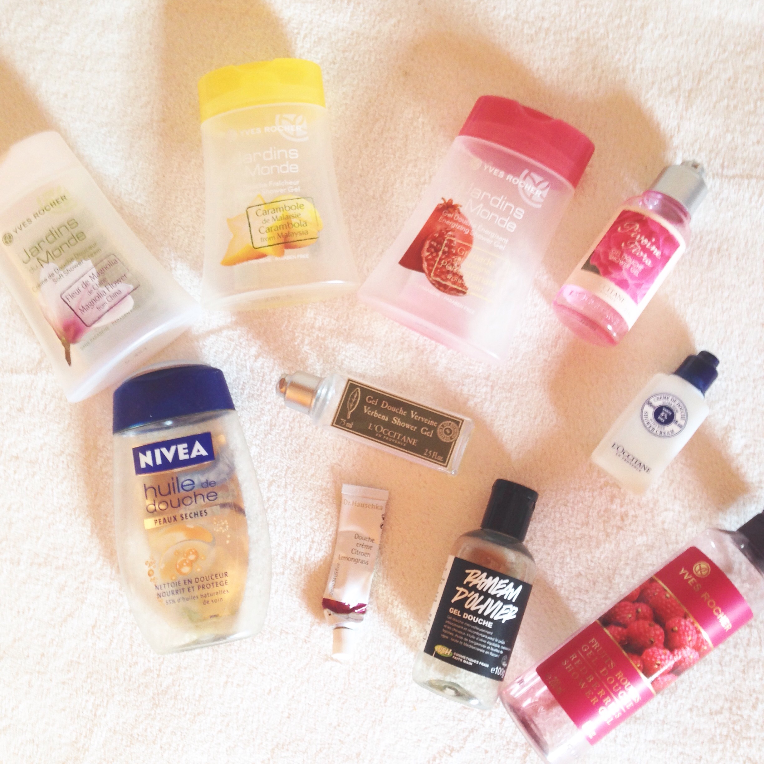 Hier (donc il y a 3 semaines, quand j’ai commencé à écrire) j’en pouvais plus de voir ce sac rempli de flacons et autres contenants vides. Alors cette fois-ci on va changer de d’habitude et je vais vous présenter uniquement les produits de la douche aujourd’hui, le reste suivra dans la semaine et ce week-end 🙂 On commence par les produits que j’utilise sous la douche et les gels douches.