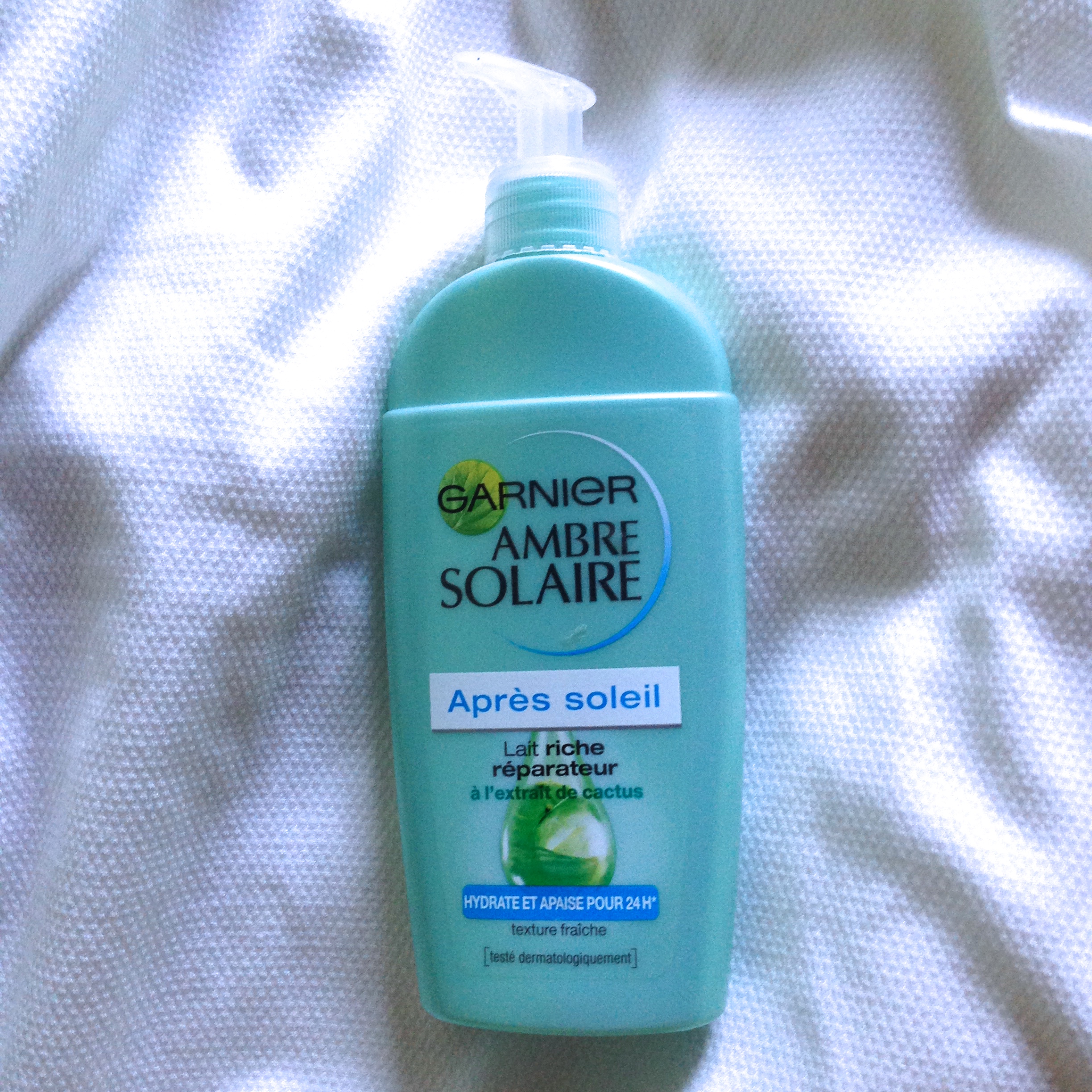 – lait réparateur apaisant après soleil Garnier Ambre solaire, environ 10€ en grandes surfaces -.