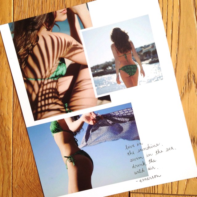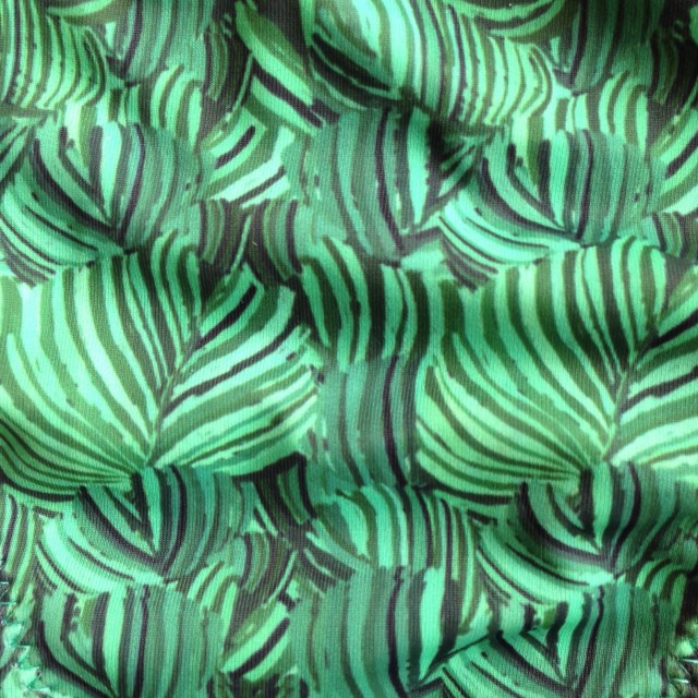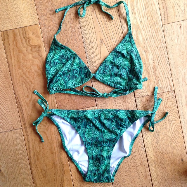 J’ai ainsi découvert un maillot deux pièces au motif tropical, feuille de palmier dans des tons de vert.